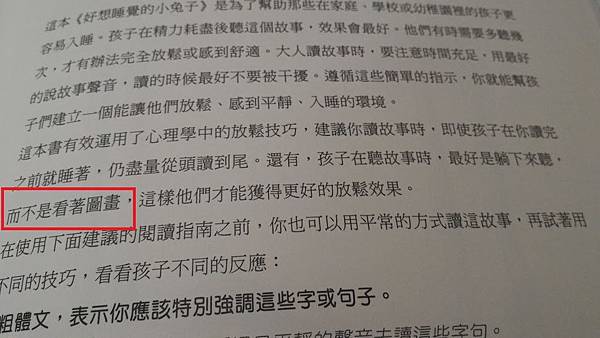 我認為,這本書只是整個睡眠儀式的成分之一,燈光、聲音與所有睡眠環境中的成分都必須配合。如果,以為只要把書唸完,孩子就會乖乖睡著,我想你會大失所望。